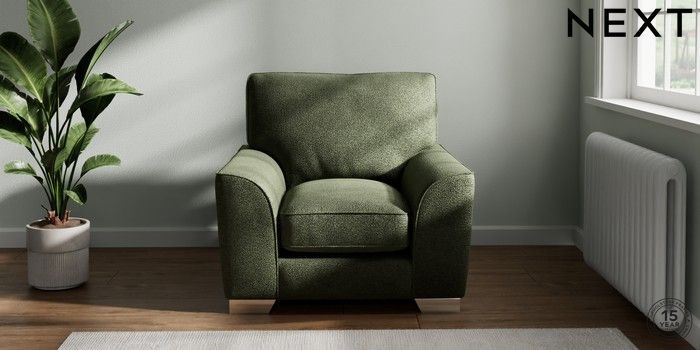 7.3.1 Buy Stamford Grand Relaxed Sit Armchair Boucle Chenille Dark Moss Green Square Angle - Chrome Metal from the Next UK online shop Click here to use our accessible website