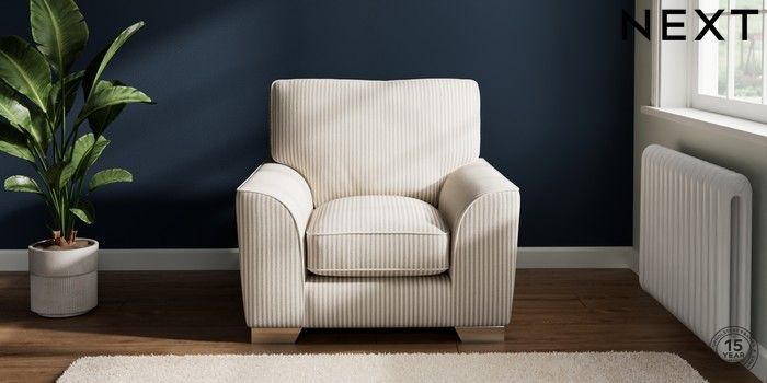 7.2.10 Buy Stamford Grand Relaxed Sit Armchair Chenille Stripe Natural Square Angle - Chrome Metal from the Next UK online shop Click here to use our accessible website