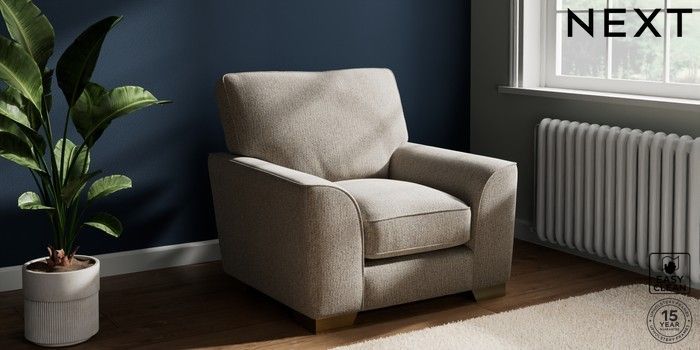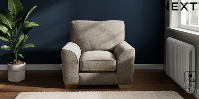 7.3.1 Buy Stamford Grand Relaxed Sit Armchair Chunky Boucle Easy Clean Dove Square Angle - Brushed Brass from the Next UK online shop Click here to use our accessible website