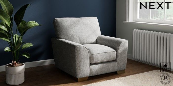 7.3.1 Buy Stamford Grand Relaxed Sit Armchair Chunky Boucle Easy Clean Light Grey Square Angle - Brushed Brass from the Next UK online shop Click here to use our accessible website