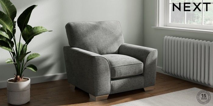 7.3.1 Buy Stamford Grand Relaxed Sit Armchair Chunky Chenille Dark Grey Square Angle - Chrome Metal from the Next UK online shop Click here to use our accessible website
