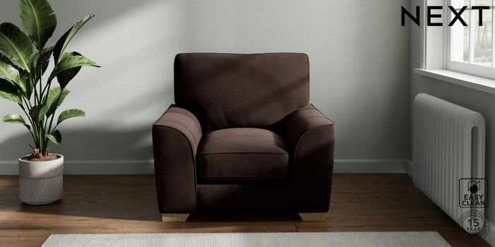 7.3.1 Buy Stamford Grand Relaxed Sit Armchair Fine Chenille Easy Clean Chocolate Brown Square Angle - Light from the Next UK online shop Click here to use our accessible website