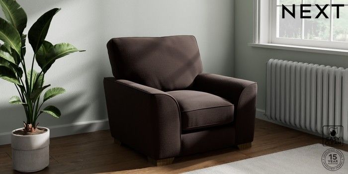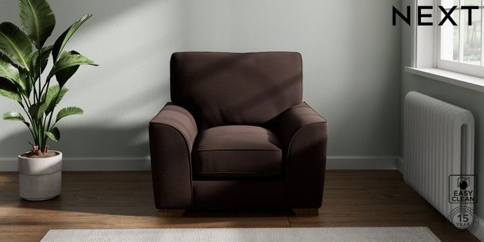7.3.1 Buy Stamford Grand Relaxed Sit Armchair Fine Chenille Easy Clean Chocolate Brown Square Angle - Mid from the Next UK online shop Click here to use our accessible website