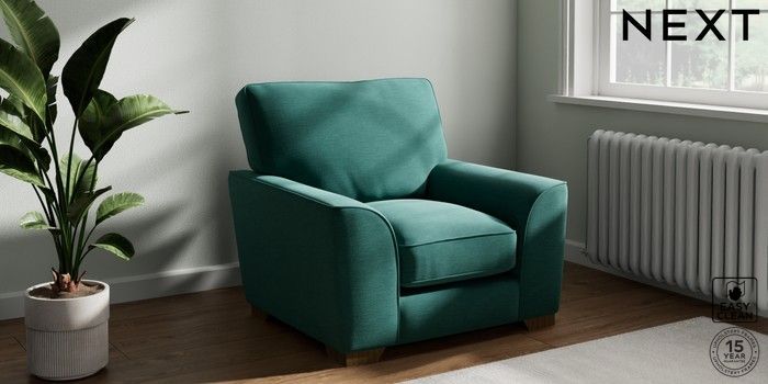 7.3.1 Buy Stamford Grand Relaxed Sit Armchair Fine Chenille Easy Clean Dark Juniper Green Square Angle - Mid from the Next UK online shop Click here to use our accessible website