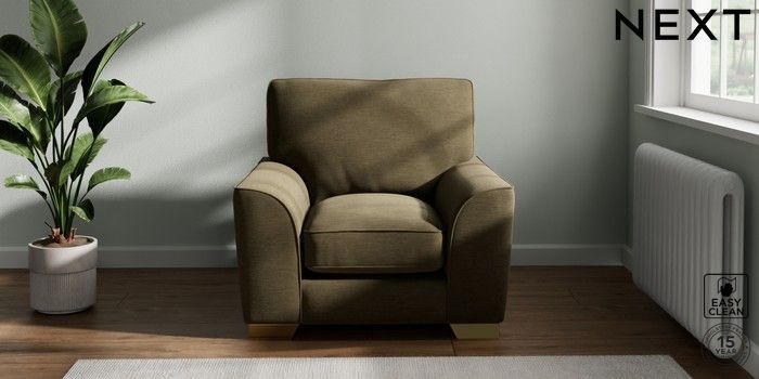 7.3.1 Buy Stamford Grand Relaxed Sit Armchair Fine Chenille Easy Clean Dark Moss Green Square Angle - Brushed Brass from the Next UK online shop Click here to use our accessible website
