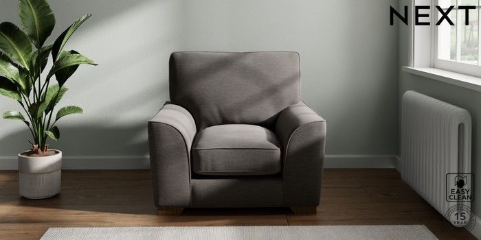 7.3.1 Buy Stamford Grand Relaxed Sit Armchair Fine Chenille Easy Clean Dark Smoke Grey Square Angle - Mid from the Next UK online shop Click here to use our accessible website