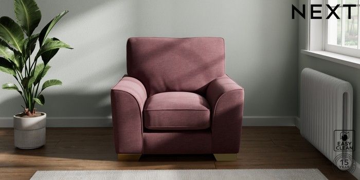 7.3.1 Buy Stamford Grand Relaxed Sit Armchair Fine Chenille Easy Clean Mid Mulberry Purple Square Angle - Brushed Brass from the Next UK online shop Click here to use our accessible website
