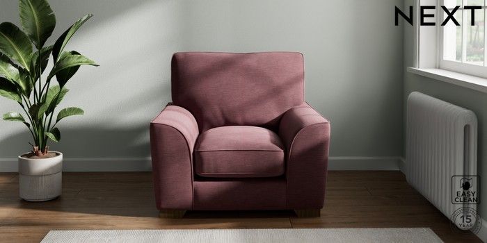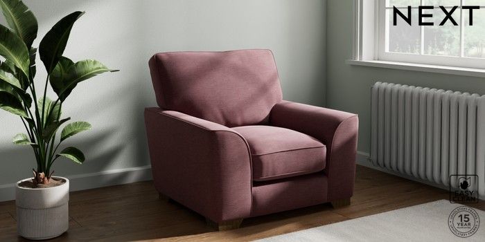 7.3.1 Buy Stamford Grand Relaxed Sit Armchair Fine Chenille Easy Clean Mid Mulberry Purple Square Angle - Mid from the Next UK online shop Click here to use our accessible website