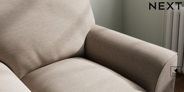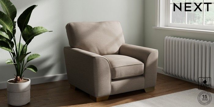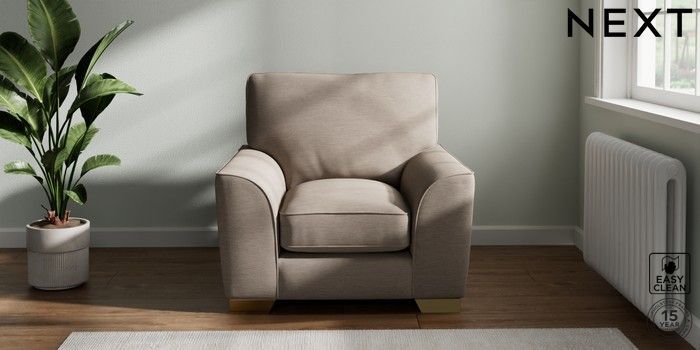 7.3.1 Buy Stamford Grand Relaxed Sit Armchair Fine Chenille Easy Clean Mid Taupe Brown Square Angle - Brushed Brass from the Next UK online shop Click here to use our accessible website