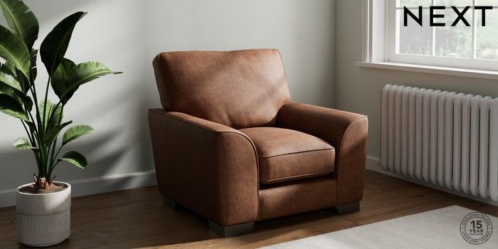 7.3.1 Buy Stamford Grand Relaxed Sit Armchair Monza Faux Leather Easy Clean Chestnut Brown Square Angle - Gunmetal from the Next UK online shop
