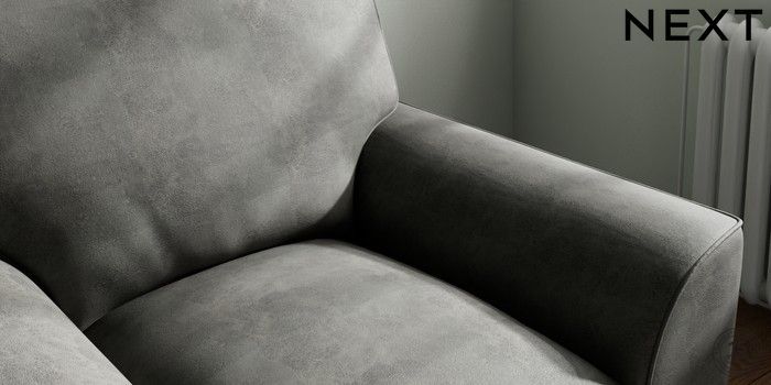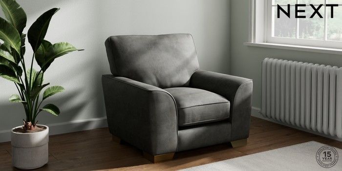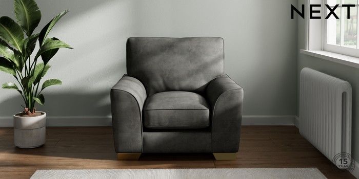 7.3.1 Buy Stamford Grand Relaxed Sit Armchair Monza Faux Leather Easy Clean Dark Grey Square Angle - Brushed Brass from the Next UK online shop Click here to use our accessible website