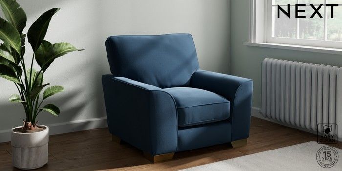 7.3.1 Buy Stamford Grand Relaxed Sit Armchair Plush Velvet Easy Clean Airforce Blue Square Angle - Brushed Brass from the Next UK online shop Click here to use our accessible website
