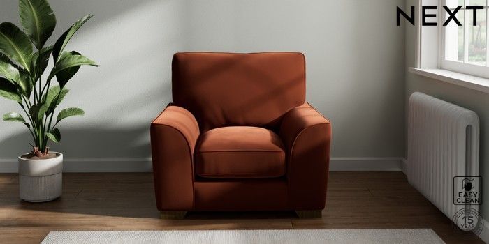 7.3.1 Buy Stamford Grand Relaxed Sit Armchair Plush Velvet Easy Clean Ginger Orange Square Angle - Mid from the Next UK online shop Click here to use our accessible website