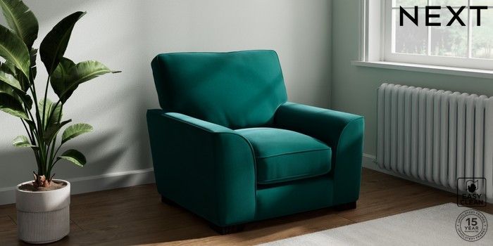 7.3.1 Buy Stamford Grand Relaxed Sit Armchair Plush Velvet Easy Clean Juniper Green Square Angle - Dark from the Next UK online shop Click here to use our accessible website