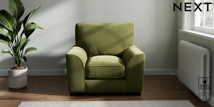 7.3.1 Buy Stamford Grand Relaxed Sit Armchair Plush Velvet Easy Clean Mid Olive Green Square Angle - Dark from the Next UK online shop Click here to use our accessible website
