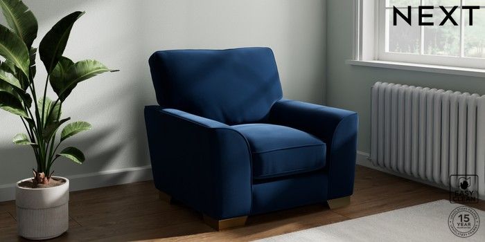 7.3.1 Buy Stamford Grand Relaxed Sit Armchair Plush Velvet Easy Clean Navy Blue Square Angle - Brushed Brass from the Next UK online shop Click here to use our accessible website