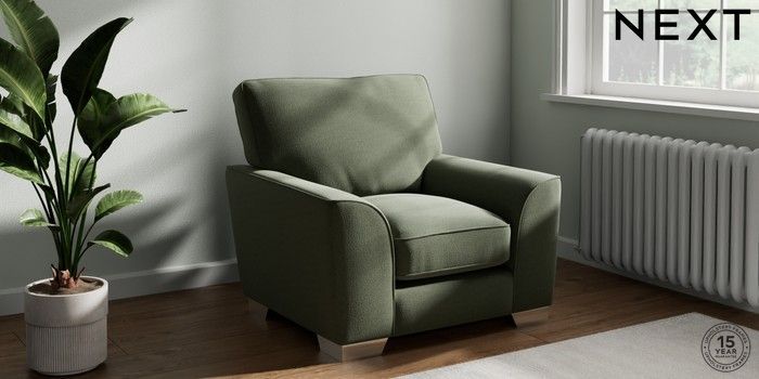 7.3.1 Buy Stamford Grand Relaxed Sit Armchair Relaxed Linen Look Dark Green Square Angle - Chrome Metal from the Next UK online shop Click here to use our accessible website