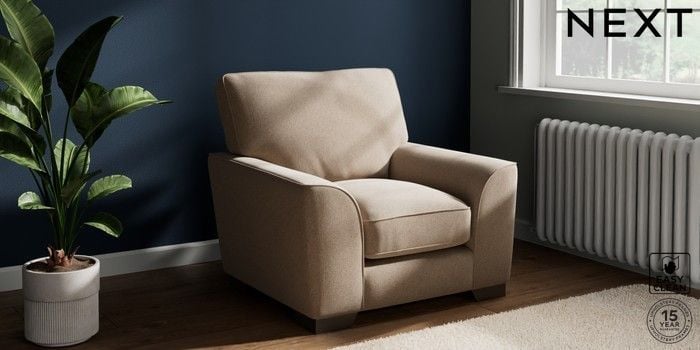 7.3.1 Buy Stamford Grand Relaxed Sit Armchair Tweedy Blend Easy Clean Light Dove Natural Square Angle - Gunmetal from the Next UK online shop