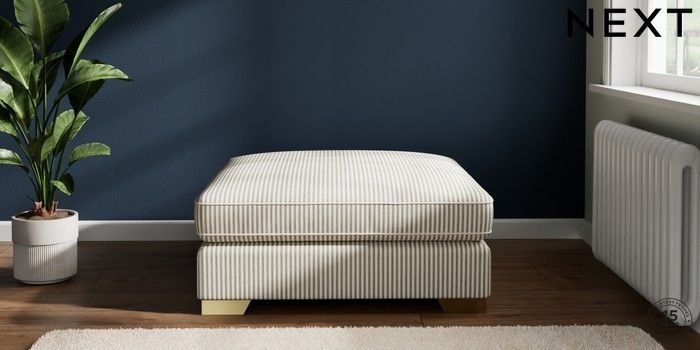 7.2.10 Buy Stamford Grand Relaxed Sit Extra Large Footstool Chenille Stripe Moss Green Square Angle - Brushed Brass from the Next UK online shop Click here to use our accessible website