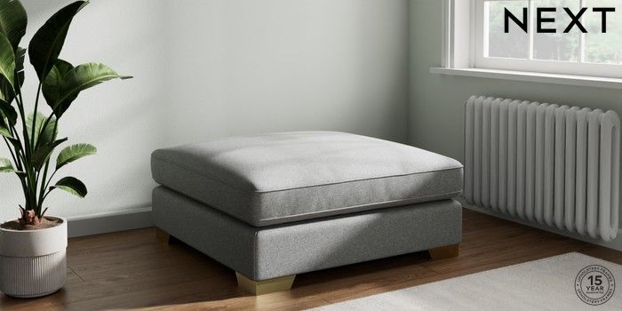 7.3.1 Buy Stamford Grand Relaxed Sit Extra Large Footstool Chunky Weave Mid Grey Square Angle - Brushed Brass from the Next UK online shop