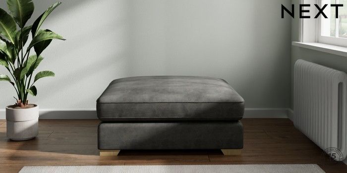 7.2.6 Buy Stamford Grand Relaxed Sit Extra Large Footstool Monza Faux Leather Easy Clean Dark Grey Square Angle - Light from the Next UK online shop Click here to use our accessible website
