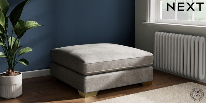 7.3.1 Buy Stamford Grand Relaxed Sit Extra Large Footstool Plush Chenille Light Grey Square Angle - Brushed Brass from the Next UK online shop