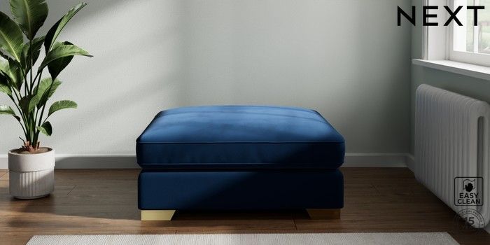 7.2.6 Buy Stamford Grand Relaxed Sit Extra Large Footstool Plush Velvet Easy Clean Navy Blue Square Angle - Brushed Brass from the Next UK online shop Click here to use our accessible website