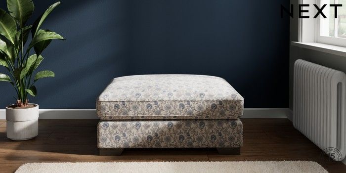 7.2.10 Buy Stamford Grand Relaxed Sit Extra Large Footstool Relaxed Linen Look Print Woodblock Floral Blue Square Angle - Gunmetal from the Next UK online shop Click here to use our accessible website