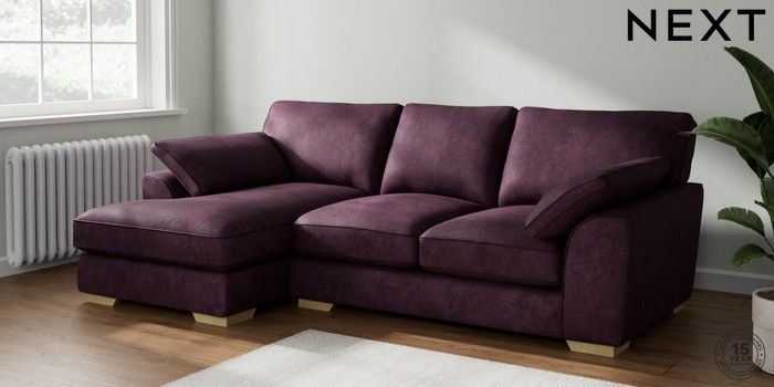 7.2.10 Buy Stamford Grand Relaxed Sit Medium Sofa Chaise - Left Hand Plush Chenille Dark Plum Purple Large Square Angle - Light from the Next UK online shop Click here to use our accessible website