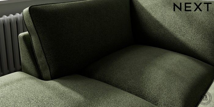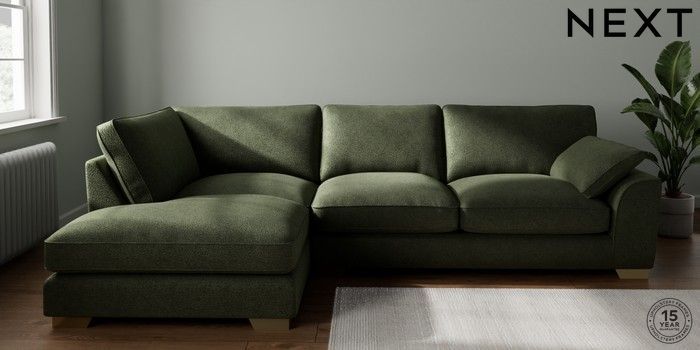 7.3.1 Buy Stamford Grand Relaxed Sit Large Corner Chaise - Left Hand Boucle Chenille Dark Moss Green Large Square Angle - Brushed Brass from the Next UK online shop Click here to use our accessible website