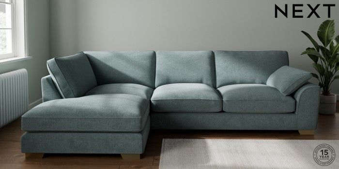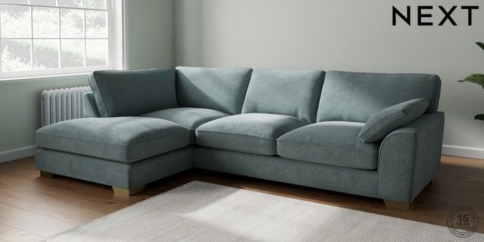 7.3.1 Buy Stamford Grand Relaxed Sit Large Corner Chaise - Left Hand Chunky Chenille Light Teal Green Large Square Angle - Brushed Brass from the Next UK online shop Click here to use our accessible website