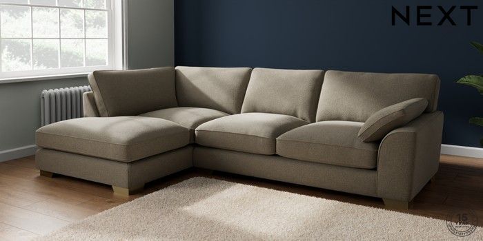 7.3.1 Buy Stamford Grand Relaxed Sit Large Corner Chaise - Left Hand Chunky Marl Light Olive Green Large Square Angle - Brushed Brass from the Next UK online shop Click here to use our accessible website