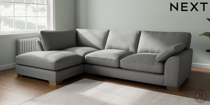 7.3.1 Buy Stamford Grand Relaxed Sit Large Corner Chaise - Left Hand Chunky Weave Mid Grey Large Square Angle - Brushed Brass from the Next UK online shop Click here to use our accessible website