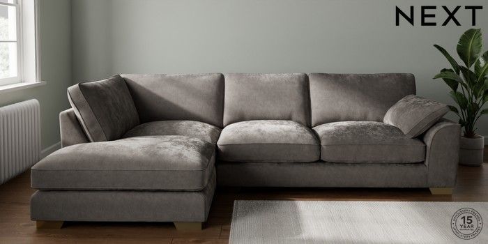 7.3.1 Buy Stamford Grand Relaxed Sit Large Corner Chaise - Left Hand Distressed Velour French Grey Large Square Angle - Brushed Brass from the Next UK online shop Click here to use our accessible website
