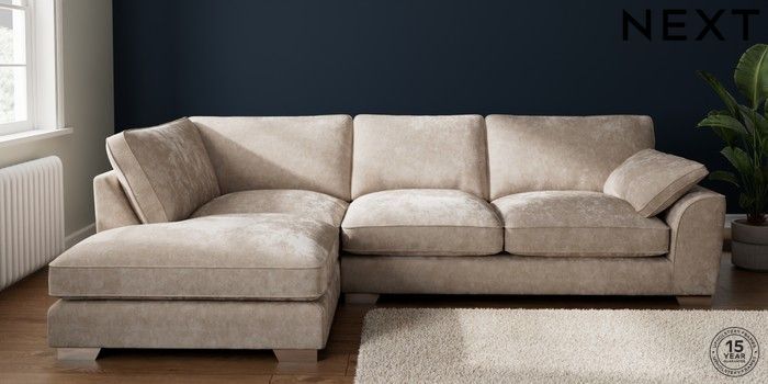 7.3.1 Buy Stamford Grand Relaxed Sit Large Corner Chaise - Left Hand Distressed Velour Mid Natural Large Square Angle - Chrome Metal from the Next UK online shop Click here to use our accessible website