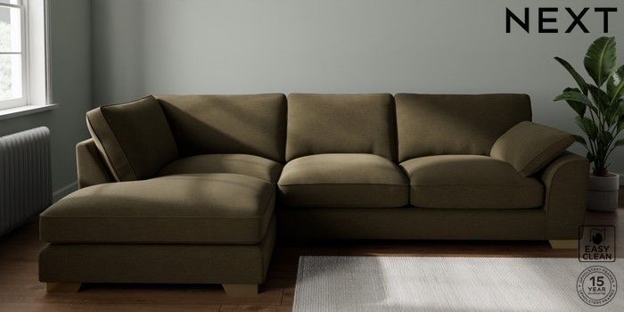 7.3.1 Buy Stamford Grand Relaxed Sit Large Corner Chaise - Left Hand Fine Chenille Easy Clean Dark Moss Green Large Square Angle - Brushed Brass from the Next UK online shop Click here to use our accessible website