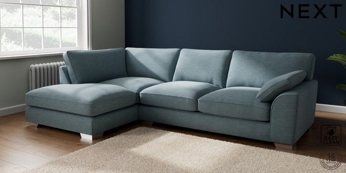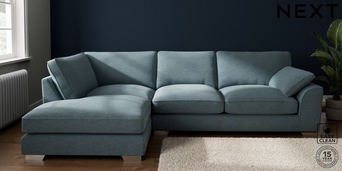 7.3.1 Buy Stamford Grand Relaxed Sit Large Corner Chaise - Left Hand Fine Chenille Easy Clean Mid Blue Large Square Angle - Chrome Metal from the Next UK online shop Click here to use our accessible website