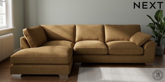 7.0.3 Buy Stamford Grand Relaxed Sit Large Corner Chaise - Left Hand Luxe Chenille Honey Yellow Large Square Angle - Chrome Metal from the Next UK online shop Click here to use our accessible website