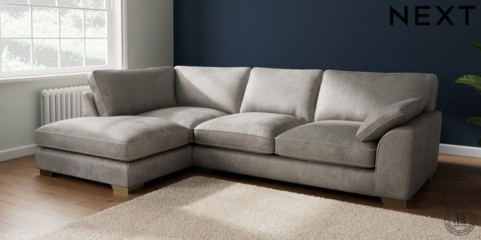7.2.10 Buy Stamford Grand Relaxed Sit Large Corner Chaise - Left Hand Plush Chenille Light Grey Large Square Angle - Brushed Brass from the Next UK online shop Click here to use our accessible website