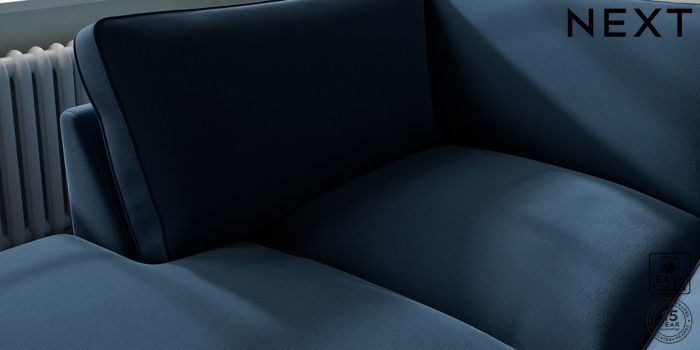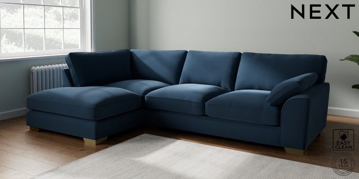 7.3.1 Buy Stamford Grand Relaxed Sit Large Corner Chaise - Left Hand Plush Velvet Easy Clean Airforce Blue Large Square Angle - Brushed Brass from the Next UK online shop Click here to use our accessible website