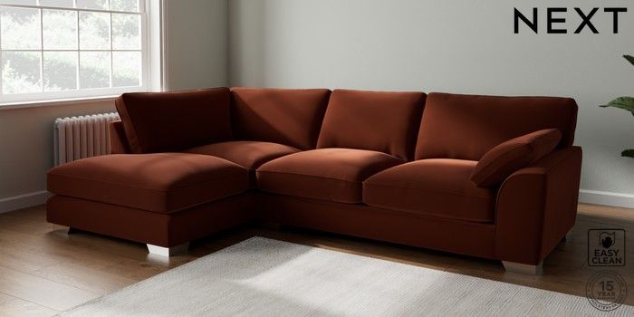 7.3.1 Buy Stamford Grand Relaxed Sit Large Corner Chaise - Left Hand Plush Velvet Easy Clean Ginger Orange Large Square Angle - Chrome Metal from the Next UK online shop Click here to use our accessible website
