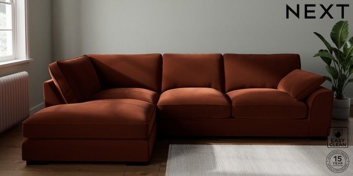 7.3.1 Buy Stamford Grand Relaxed Sit Large Corner Chaise - Left Hand Plush Velvet Easy Clean Ginger Orange Large Square Angle - Dark from the Next UK online shop Click here to use our accessible website