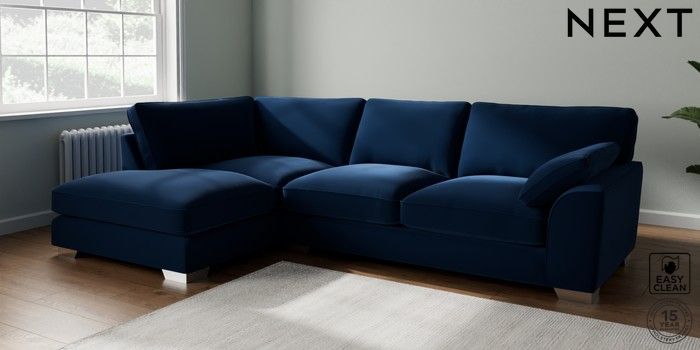 7.3.1 Buy Stamford Grand Relaxed Sit Large Corner Chaise - Left Hand Plush Velvet Easy Clean Navy Blue Large Square Angle - Chrome Metal from the Next UK online shop Click here to use our accessible website