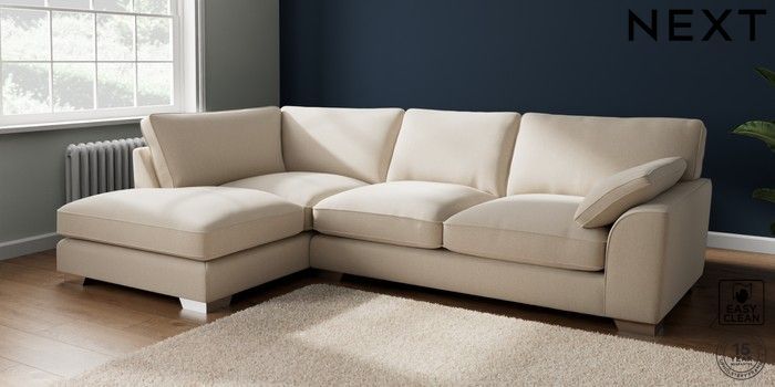 7.3.1 Buy Stamford Grand Relaxed Sit Large Corner Chaise - Left Hand Tweedy Blend Easy Clean Oyster Large Square Angle - Chrome Metal from the Next UK online shop Click here to use our accessible website