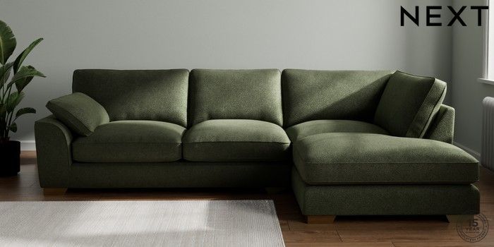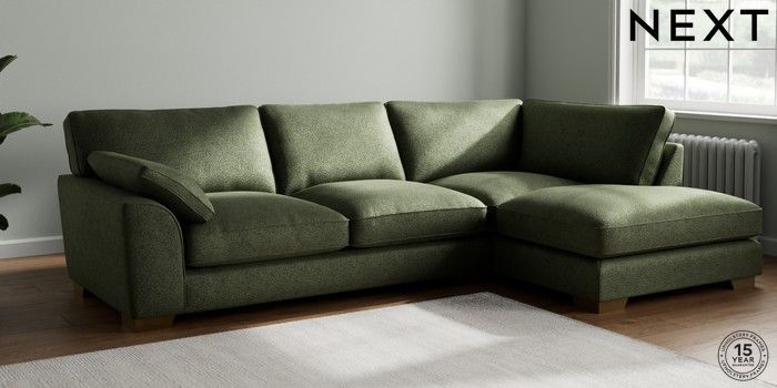 7.3.1 Buy Stamford Grand Relaxed Sit Large Corner Chaise - Right Hand Boucle Chenille Dark Moss Green Large Square Angle - Brushed Brass from the Next UK online shop Click here to use our accessible website