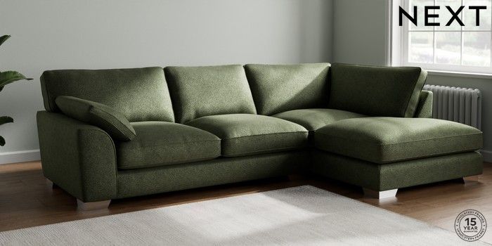 7.3.1 Buy Stamford Grand Relaxed Sit Large Corner Chaise - Right Hand Boucle Chenille Dark Moss Green Large Square Angle - Chrome Metal from the Next UK online shop Click here to use our accessible website