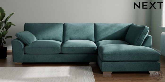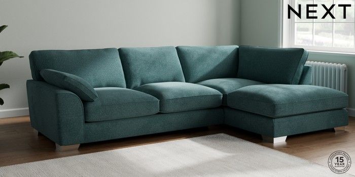 7.3.1 Buy Stamford Grand Relaxed Sit Large Corner Chaise - Right Hand Chunky Chenille Mid Teal Green Large Square Angle - Chrome Metal from the Next UK online shop Click here to use our accessible website