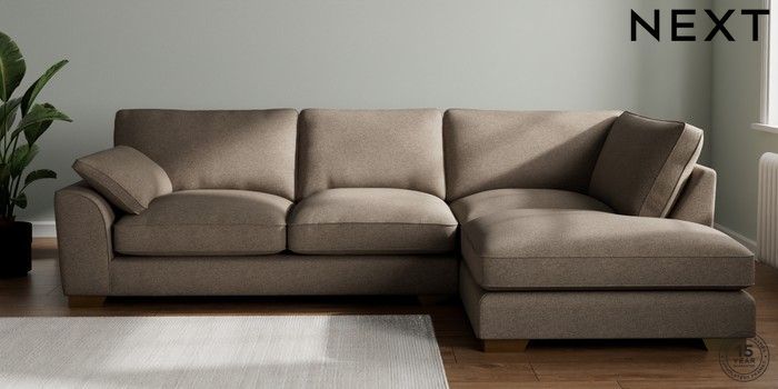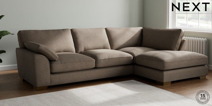 7.3.1 Buy Stamford Grand Relaxed Sit Large Corner Chaise - Right Hand Chunky Weave Dark Natural Large Square Angle - Brushed Brass from the Next UK online shop Click here to use our accessible website