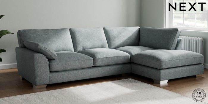 7.3.1 Buy Stamford Grand Relaxed Sit Large Corner Chaise - Right Hand Chunky Weave Mid Blue Large Square Angle - Chrome Metal from the Next UK online shop Click here to use our accessible website