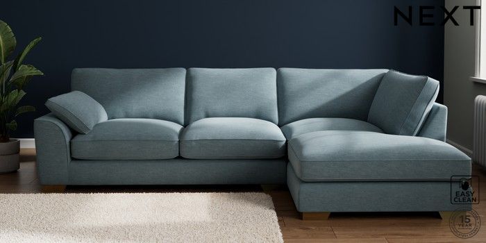 7.3.1 Buy Stamford Grand Relaxed Sit Large Corner Chaise - Right Hand Fine Chenille Easy Clean Mid Blue Large Square Angle - Brushed Brass from the Next UK online shop Click here to use our accessible website